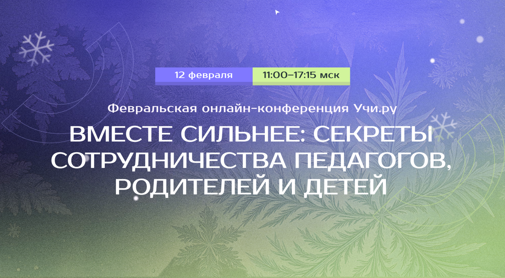 12 февраля пройдет всероссийская онлайн-конференция Учи.ру для педагогов «Вместе сильнее: секреты сотрудничества педагогов, родителей и детей». В центре повестки — диалог между школой и семьей как ключевой фактор образовательных результатов ребенка. Участники обсудят эффективное взаимодействие родителей с учителями, разберут подходы к поддержке учеников с разными образовательными потребностями, а также методы, которые помогают педагогам справляться со сложными коммуникациями. Партнеры конференции: Российское общество «Знание» и Форум классных руководителей.